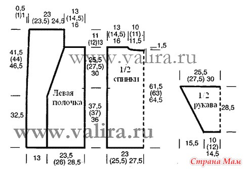 Рукав пришить к верхним по 25,5 (27,5) 30 см боковых сторон спинки и переда, середина рукава должна совпадать с плечевым швом.