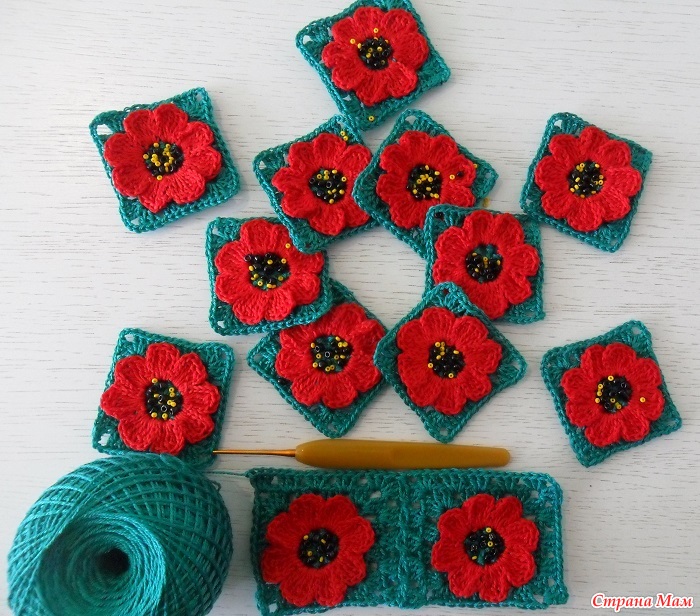 мак ввязанный в квадратный мотив ( а почему бы и нет?), красные нитки -Сосо 240м в 50гр, крючок 2, зеленые -нарцисс,390м в 100гр, одна сторона квадрата 7см, на малышку 5 лет, хватило 7 квадратов