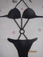 Для нижней части купальника использовала трусики, разрезанные по боковым швам. Прикладывала к образцу. По краям ввязывала спандекс черного цвета.