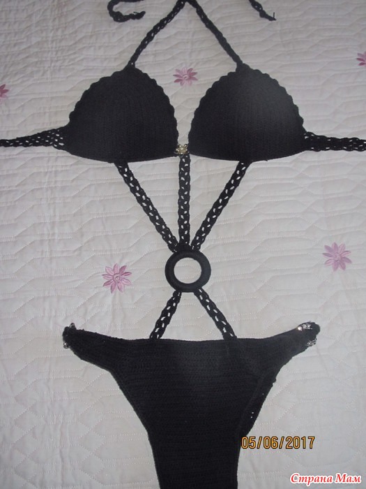 Вязать приходилось на улице, при дневном свете. Для вязания купальника использовала полустолбик с накидом. Полотно получается плотным, не просвечивает. Вязала крючком 1,75 в одну ниточку.