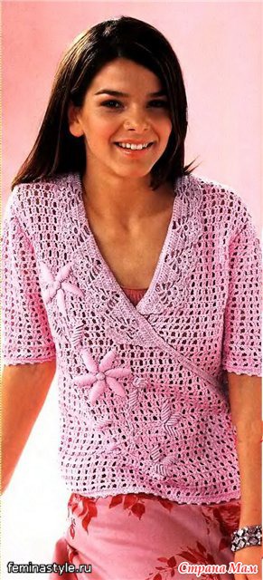Пришить кружевной воротник к краю выреза, как на фото, и ленту до бокового шва. Втачать рукава, выполнить боковые швы и швы рукавов. Обвязать нижние края и края рукавов розовой нитью по 1 круговому р. ст. б/н и пико (* 2 ст. б/н, 3 возд. п.% 1 ст. б/н в 1-ю возд. п., пропустить 1 п. предыдущего ряда, повторять от *).