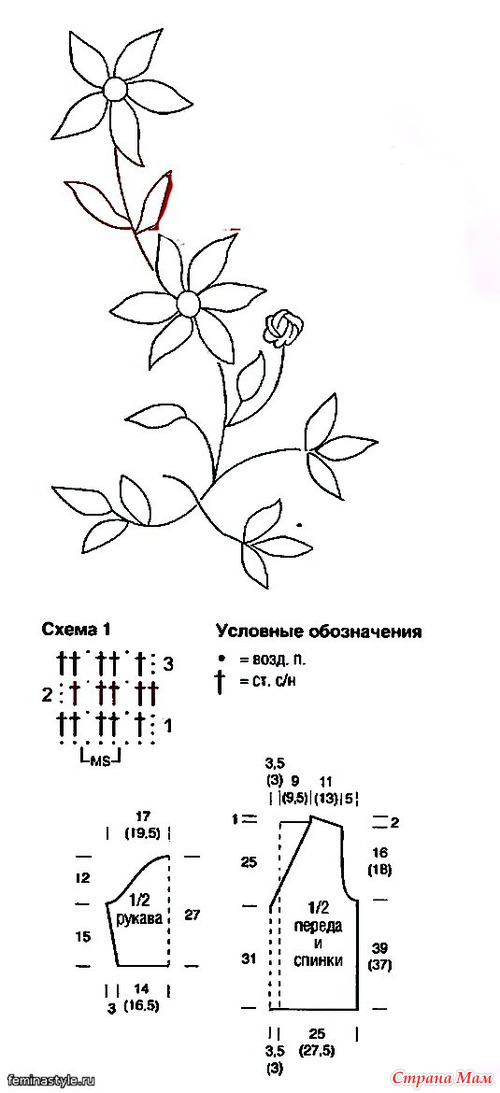 Вышивка: вышивать двойной нитью цвета пыльной розы по рисунку (увеличить до 400%). Вышить стебли тамбурным швом, лепестки отдельными стежками, листья и бутон швом "рококо ’. В середине цветков выполнить по 1 "шишечке" (провязать 5 незаконченных ст. с/н вместе и связать 1 возд. п.).