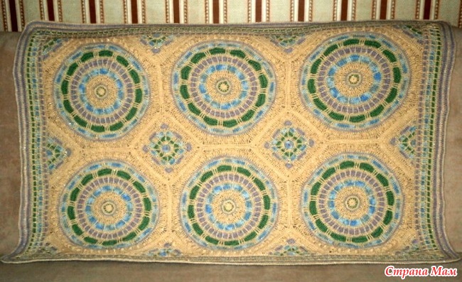 В этом маленьком пледике я использовала разную пряжу. Основная фоновая - Костер (акрил с люрексом) цвета вереска. Другие цвета - секционный сине-голубой (Пчелка), зеленый горох (Каролина) и сиреневый (Ольга). Крючок № 3,5. Вереск с люрексом в полотне выглядит как искристый известняк. Озарилась я этой идеей и все преодолела. Видели бы вы схемы, с которыми пришлось проходить путь познания! Но все позади. Задуманное свершилось.