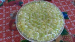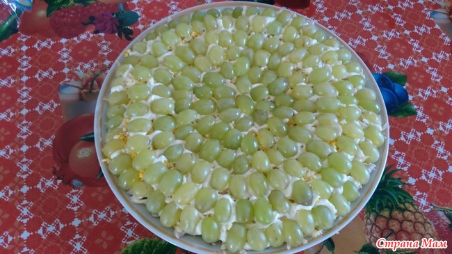 И заключительный этап: виноград режем на половинки и выкладываем на салатик.