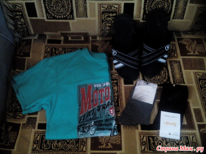 Футболка, шлепки, носки. И футболка, и шлепки подошли. Фигура у сына нестандартная, поэтому сразу примерили. Носки не мер или, но уверена, что подойдут
