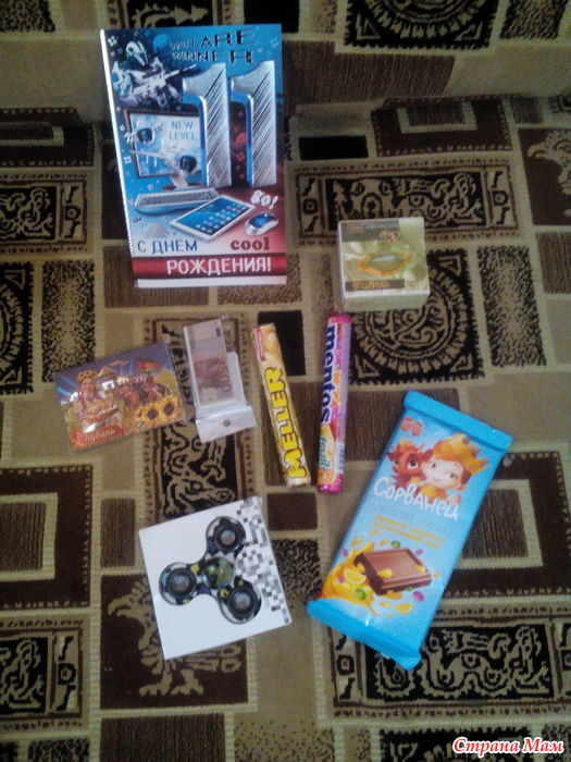 Открытка, спинер, сладости, стерка ( в виде денежки), магнит на холодильник ( Рафаэль сразу его прикрепил на холодильник, к коллекции, мне мыло