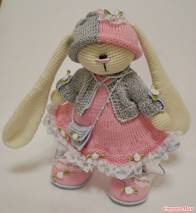 Это повтор ранее связанной Зайки - Кокетки с несколькими изменениями в одежде (туфельки, сумочка, оформление платьица).