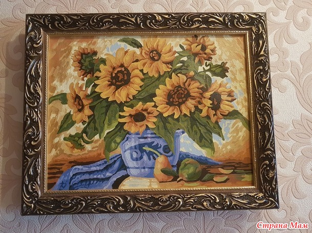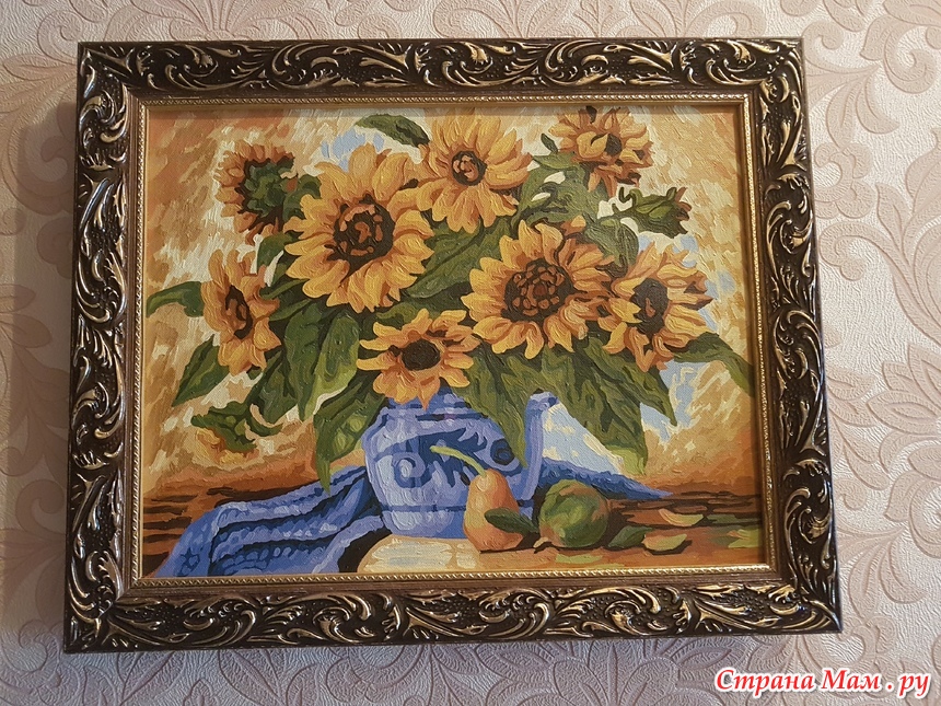 Давно хотела нарисовать эту картинку. Схема хорошая, легкая. Размер 30х40. Нарисовала я ее за 1 выходной день. Подсолнухи получились такие солнечные)