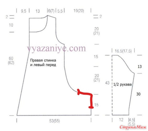 На высоте проймы рукава 20 (21) см для плечевого скоса с правого края закрыть 1 х 3 (4) п., затем в каждом 2-м р. закрыть 1 x 3 п. и 2 x 4 п. (3 x 4 п.).