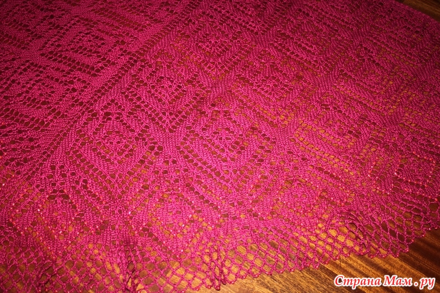 Связалась у меня шаль "Букет из гладиолусов" по онлайну от Аленький 13 https://www.stranamam.ru/post/12815974/?page=8#comments, очень красивый дизайн. Пряжа полушерсть (30% шерсти,70% акрила,1600м в 100г.) от ТМ "Наша пряжа", расход 140 г, вязала в 3 нити, спицы №2,5, бисер китайский, около 70 г. Размер 165 на 83 см, делала 4 повтора тела шали. Ну и фото красотки