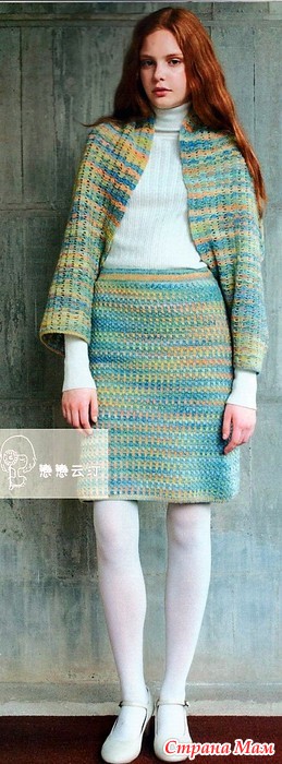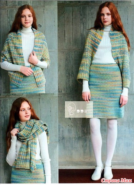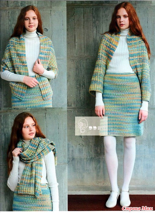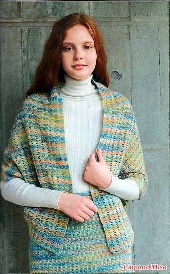 Этот костюм оригинален тем что его верх может быть и жакетом и накидкой и шарфом благодаря его выкройке-трубе.
