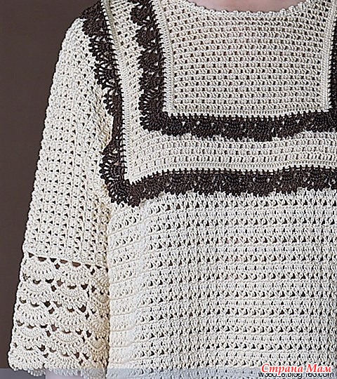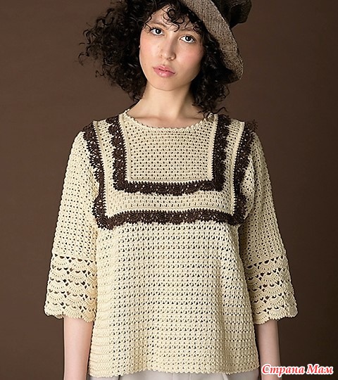 Эта бежевая кофточка в винтажном стиле вяжется красивыми узорами. Она имеет квадратную кокетку которая обвязана оборками контрастного коричневого цвета.