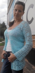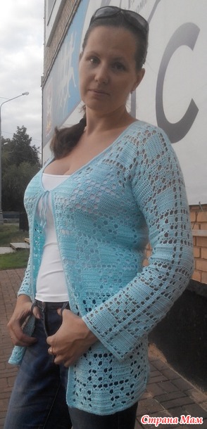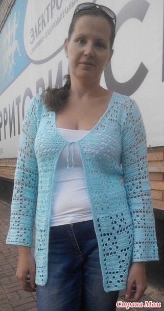 Решила этим летом закончить все недовязы. Очередной жакет из Семеновской "Нежности". крючок 2,5, цвет 6125 ледяной