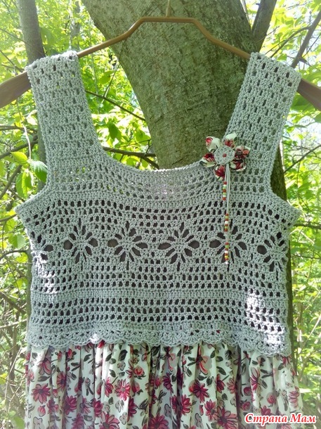 Всем доброго вечера! Вот такой летний комбинированный сарафан для дочери у меня связался-сшился!!! Верх выполнен крючком из хлопковой пряжи, а юбка из х/б ткани.