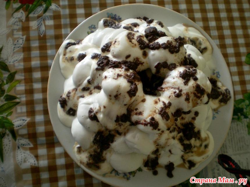 Сметану взбить с сахаром. Не долго. Каждый шарик обмакнуть в крем, выложить в форме “вулкана”.
