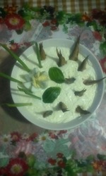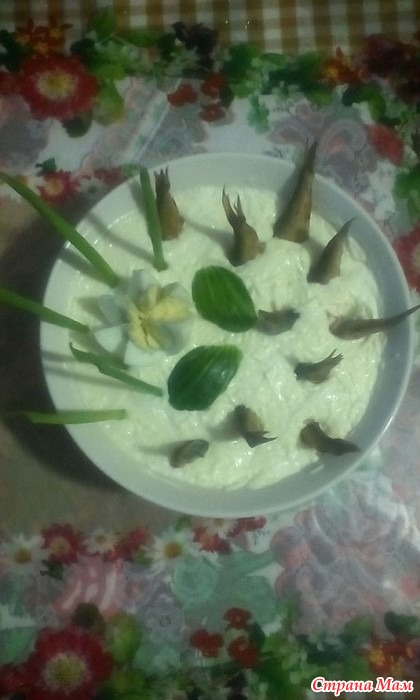 Верхний слой покрыть майонезом, посыпать рубленой зеленью и аккуратно воткнуть хвостики шпрот и перышки зеленого лука.