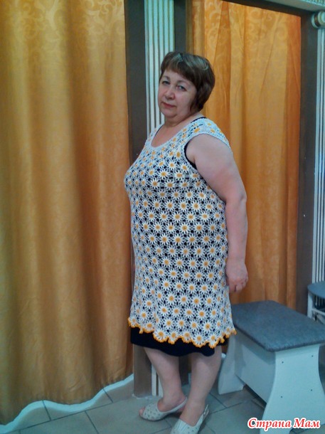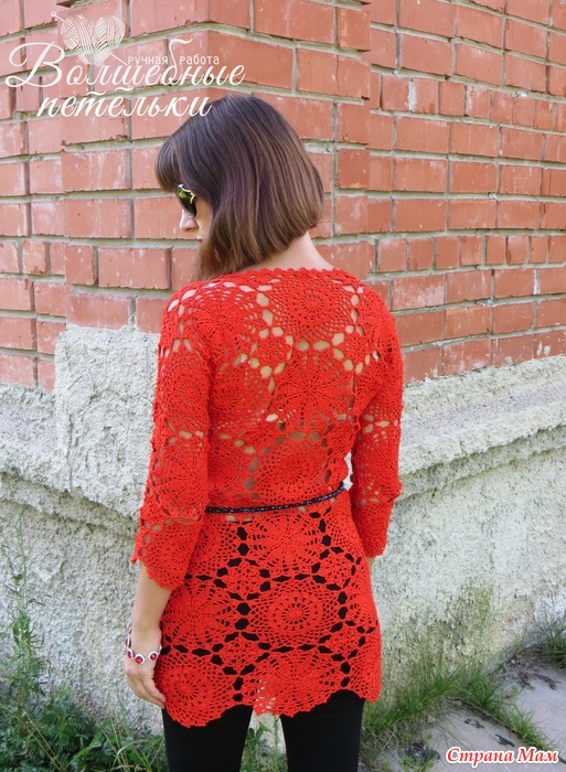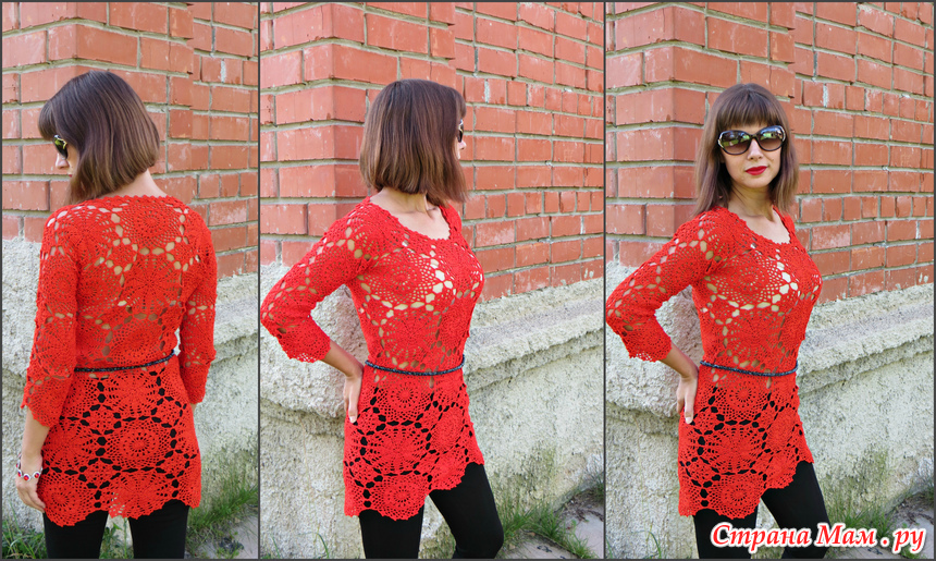 . Вот подумываю связать подобными мотивами, но уже платье и в другом цвете, например, в белом. А пока выгуливаю свою красную тунику. Ношу с топами, а фотографировала специально с бесшовным бельём телесного цвета.