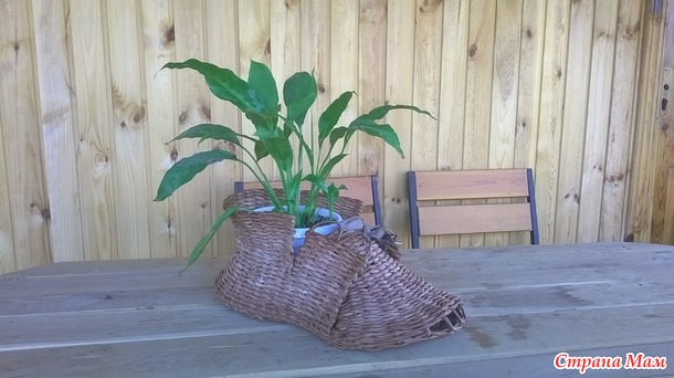 Немного научившись плести корзинки из бумажной лозы я взялась за большую работу. Встретив видео сплетенного башмака я прям загорелась, он у меня должен быть. Но маленький опт в плетении сделал своё дело, хотелось бросить на пол-пути. Но все же я его доплела. Подарила родителям мужа, они остались очень довольны. Материал - газетная полоса, спица 2,0 мм, клей ПВА, лак акриловый, тонировала морилкой цвета МОККО.