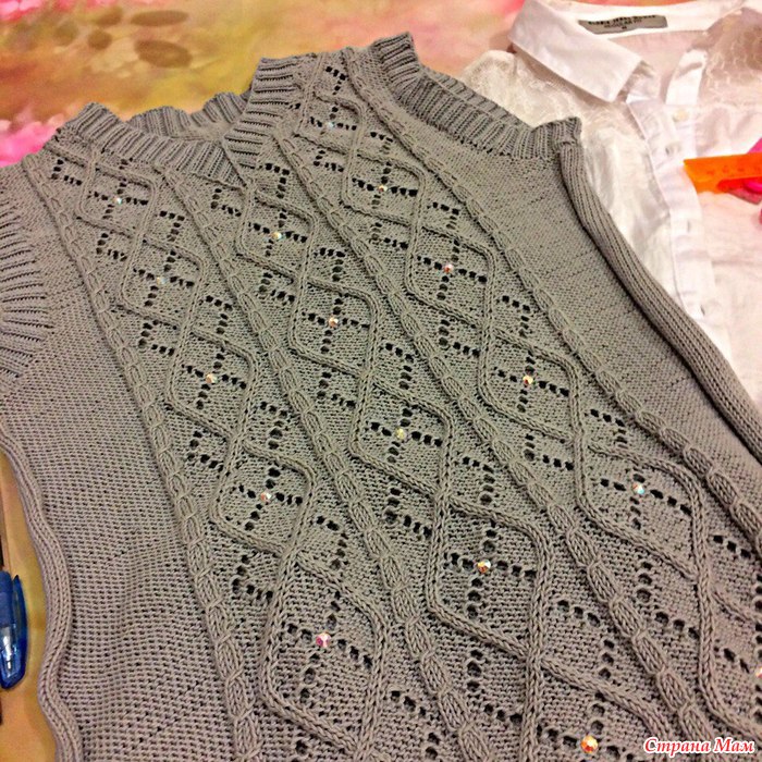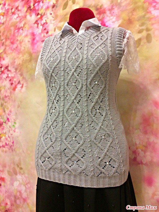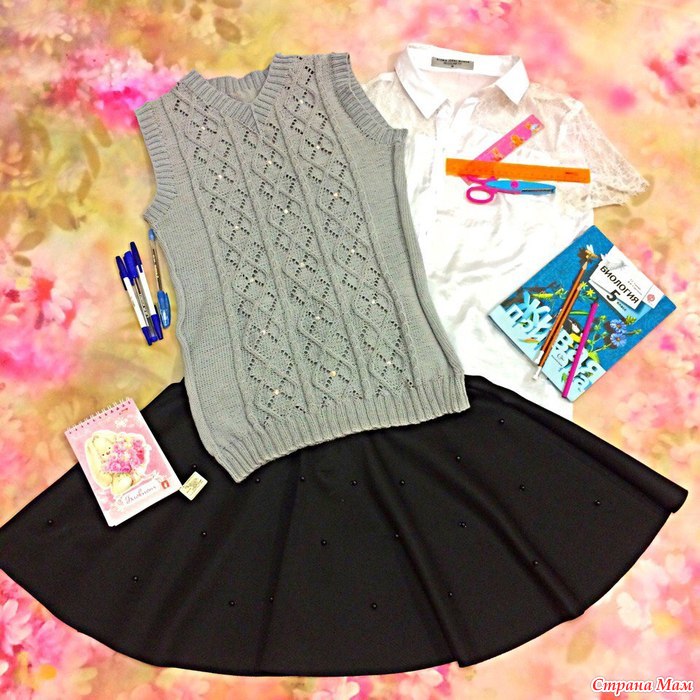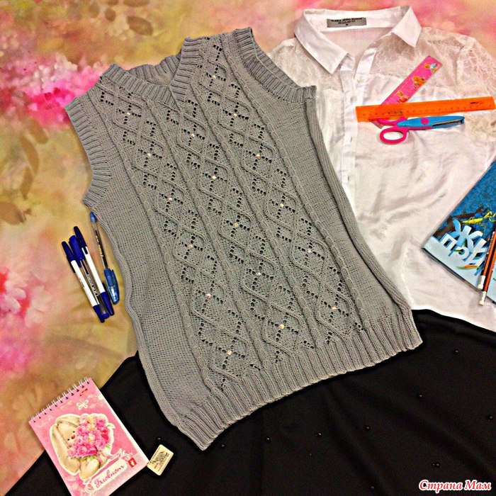 Добрый вечерок дорогие рукодельницы. Представляю Вашему вниманию жилет. Связала я его для своей младшей дочки школьницы. Лично у меня одежда для школы всегда ассоциируется с неяркими тонами, сдержанности в одежде. Но тут я позволила себе некую смелость. Я добавила к жилету стразы. Данная схема лежала у меня долго в хомячьих закромах.