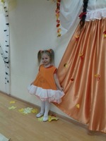 она одна у нас в сарафанчике и в серединке.Оборочку пришила крупным стежком, для того, что бы иметь возможность отпороть её и носить сарафан на каждый день.