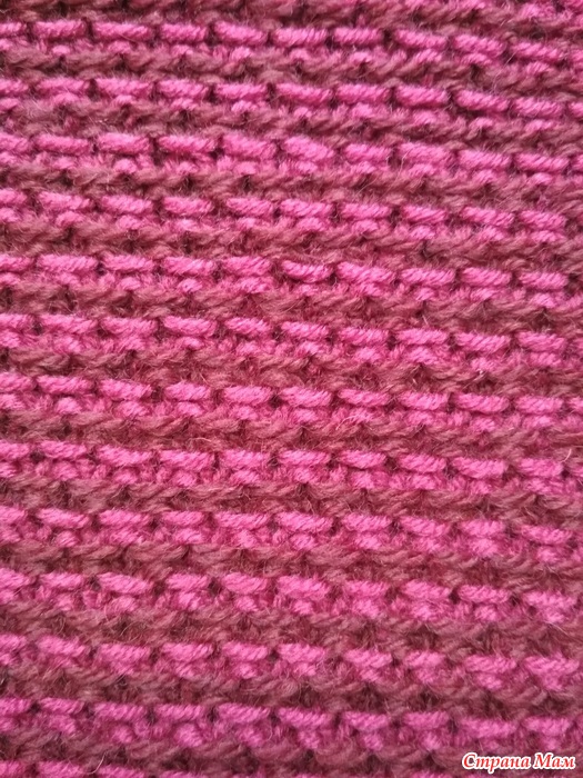 А этой осенью невестка захотела и снуд к ней. Пряжи осталось немного – грамм 40. Тогда я добавила остатки от своего бордового комплекта из Подмосковной пряжи. Тут цвет потемнее. Вяжу спицами 4,5 мм.
