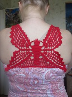 Недавно просила схемку бабочки. В результате связала два варианта. Один подошёл для майки (на фото), а другой стал основой для сумки. Если доведу сумку до ума-покажу. А майка получилась как задумывала.