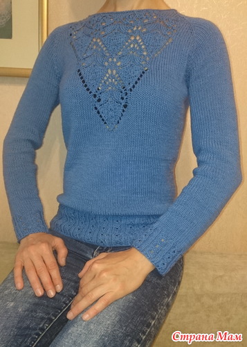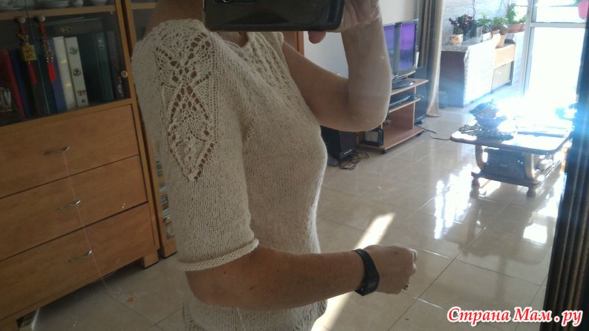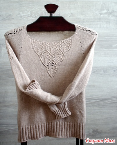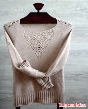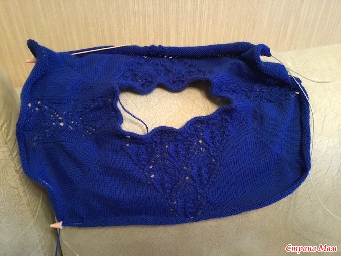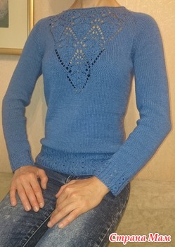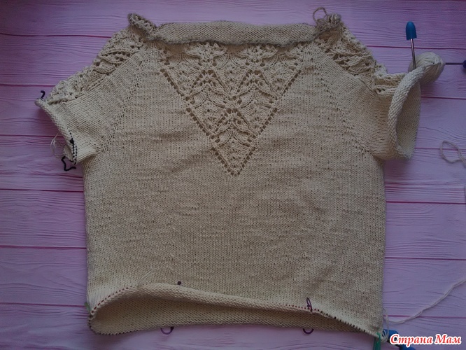 Ажура на спинке нет, вырез каре с декольте мне был не нужен, поэтому я сделала круглую горловину. Росток вязала сразу от горловины (ажура-то на спинке нет