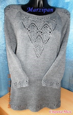 С размером вообще не понятно - вязала маме, пока вязала тушку, казалось что размер огромный. Закончила тушку, померила на себя - чуть великоват, значит маме самое то будет. Связала половину рукава, решила снова померить, чтобы с длиной определиться - он стал мне в пору. В итоге сейчас размерчик мой. Надеюсь ВТО немножко поправит ситуацию, все же смогу маме подарить, если нет, то буду носить сама... перезакрыла низ, изнаночными стягивало, закрыла иглой.