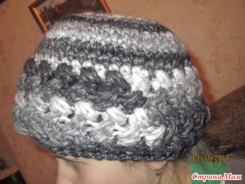 Я только недавно связала шапку. Училась вязать по видео из интернета. Связала шапку за пару часов, толстыми нитками, крючком №5.
