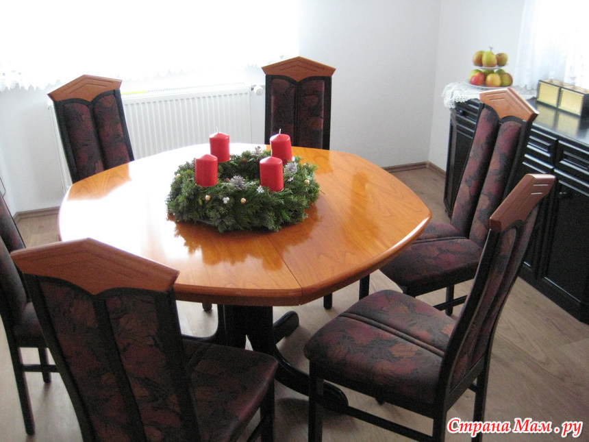 А такой Weihnachten Adventskranz стоит у меня на обеденном столе. Оформление ещё не закончила, после работы доделаю. Первую свечу зажжём в воскресенье 3-го декабря.