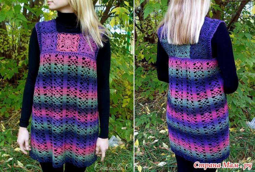 Жилет-туника связан из пряжи секционного окрашивания Дундага (чистошерстяная). Схема мотива приложена. Основной узор- есть мастер-класс Кристины Богдановой, вяжем по схеме №21. Крючок 2,75. Ушло 280 гр.