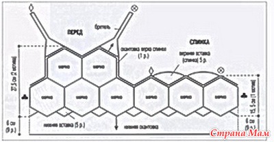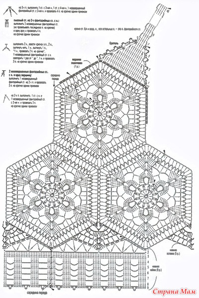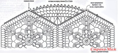 На схеме показан общий план работы. Мотивы вяжутся по отдельности, соединяясь в последнем ряду согласно приведенной схеме. Затем обвязывается верх топа, после этого низ топа по приведенным схемам. К сожалению, схем лучшего качества в моем распоряжении нет.