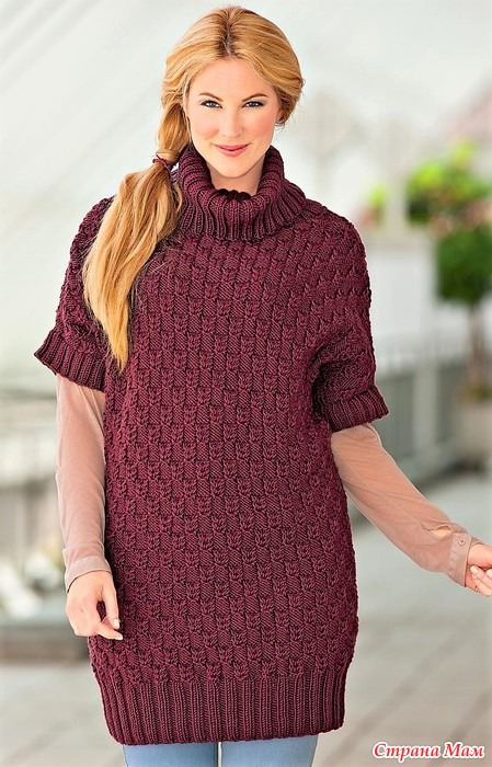 Удлиненный свитер с воротником гольф. Спицы.