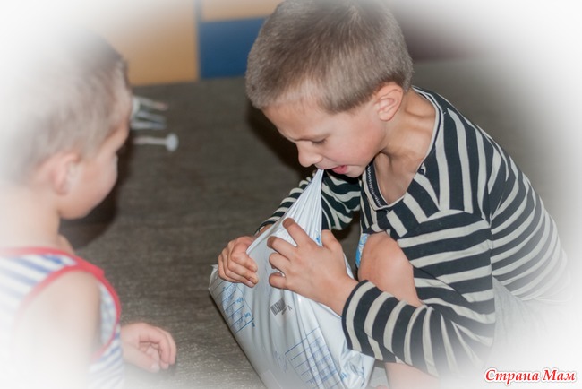 вот так начинаем распаковывать. "Ратибр помоги мне!" - попросил именинник, а ножниц в доме видимо нет