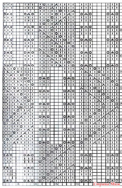 Схема показываем ЛР, в ИР петли вяжем по узору. Накиды вывязывать изнаночными.