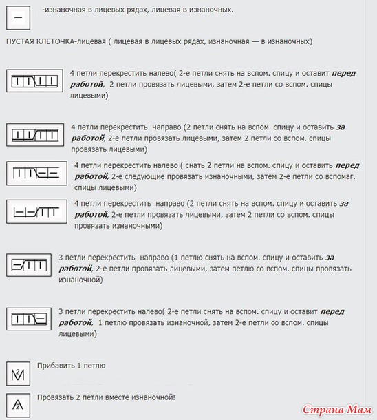 Синий квадрат на сх. обозначает отсутствие петли. Следует перейти к вязанию след. элемента. Петля, выделенная зеленым цветом, вывязывается как 2 вместе лицевой.