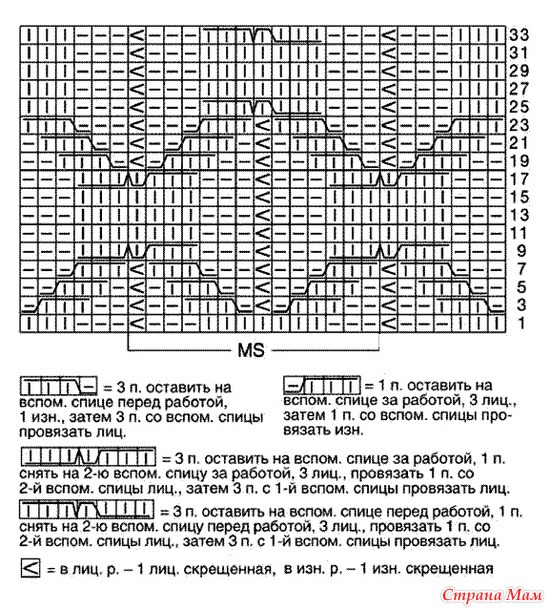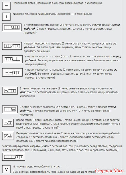 В ЛР жгуты вяжем по схеме спицами, в ИР – по видимому рис-ку. Начинаем с 1кр., далее – петли до Р, повтор Р нужное число раз, в завершение – 1кр.