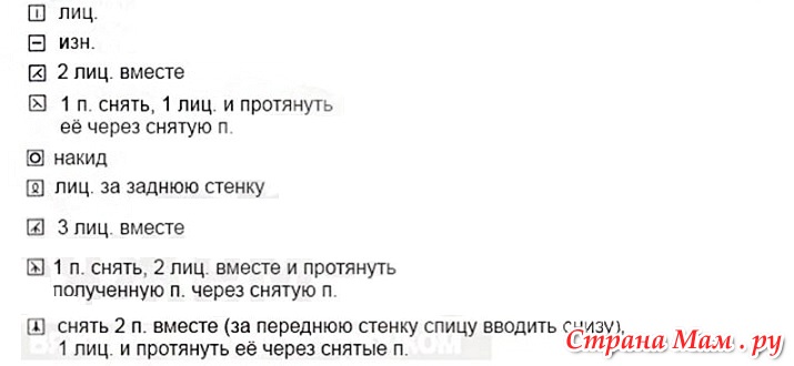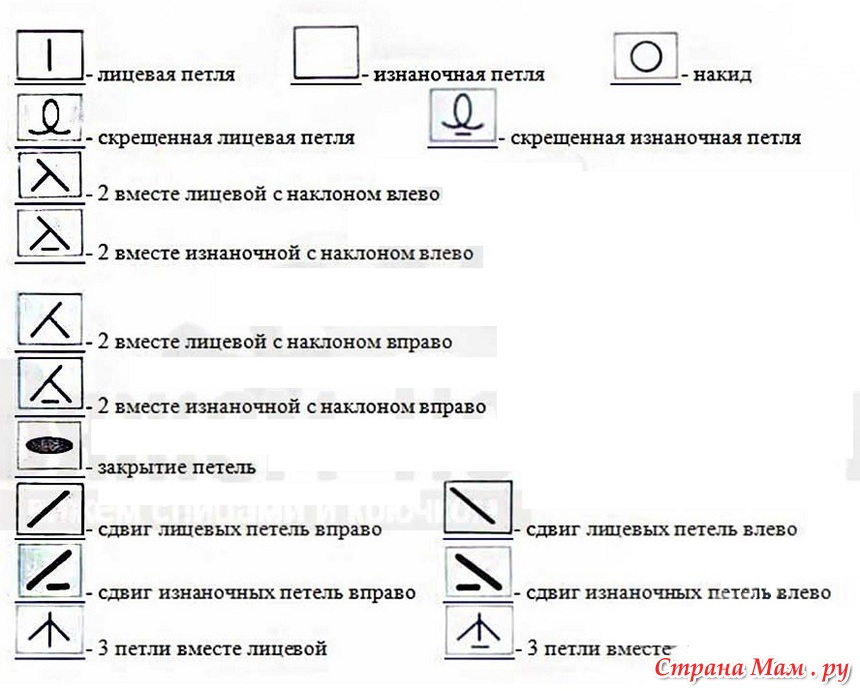 Синий квадрат на сх. обозначает отсутствие петли. Следует перейти к вязанию след. элемента. Петля, выделенная зеленым цветом, вывязывается как 2 вместе лицевой.