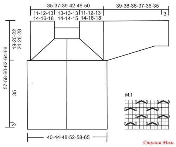 Перейти на круговые спицы 4 мм. Далее вязать по схеме M.1 (первый р. = изн. стороны), крайние 10 п. планки вязать платочной вязкой. На высоте примерно 35 см (закончить после изн. р.), перейти снова на круговые спицы 3.5 мм. Вяжите платочной вязкой 3 см, СВОБОДНО закройте п. (при закрытии п. используйте круговые спицы 4 мм, чтобы избежать слишком тугого края).