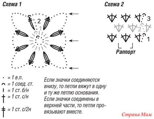 Для 1-го квадрата выполнить цепочку из 8 в. п. и замкнуть ее в кольцо с помощью 1 соед. ст. Выполнить 2 круговых ряда согл. схеме, при этом каждый круговой ряд начать с приведенного числа в. п. вместо 1-й петли и закончить 1 соед. ст.
