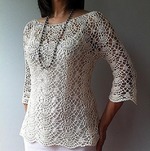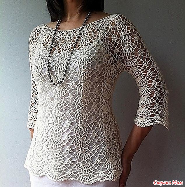 Так то я понимаю, что вяжется этот топ сверху вниз, идет круглая кокетка на высоту четырех схем (у модели), сзади всего скорее росток в еще одну схему. Потом идет разделение на рукава и "тушку".