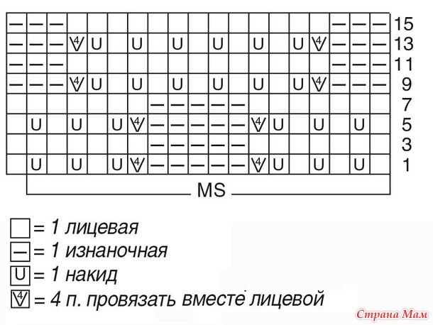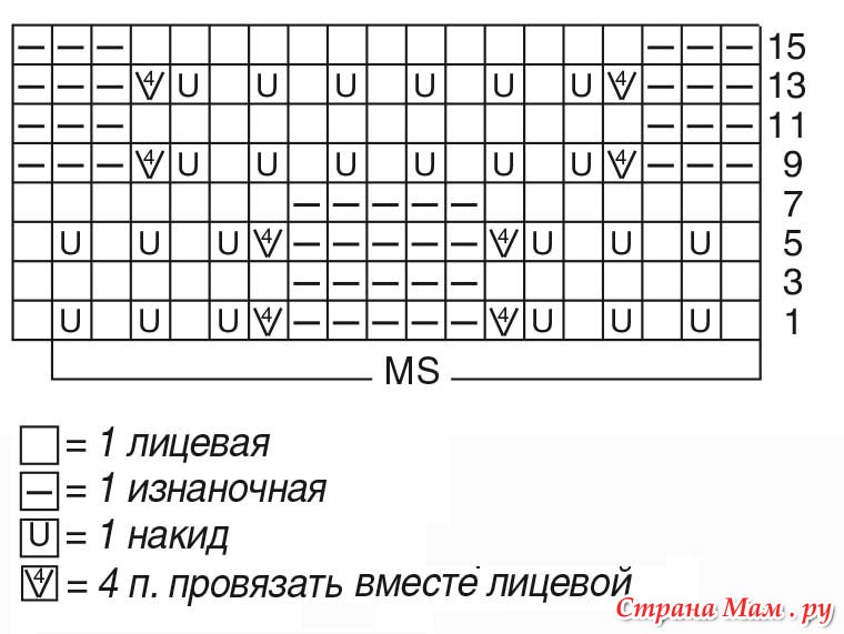 Вязать по приведенной схеме. На ней даны только лицевые ряды. В изнаночных рядах петли провязывать по рисунку, накиды – изнаночными.