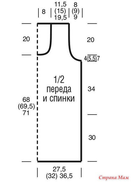 Оставшиеся 79 (93) 111 п. закрыть в одном ряду на высоте 24 (25,5) 27 cм от начала пройм.