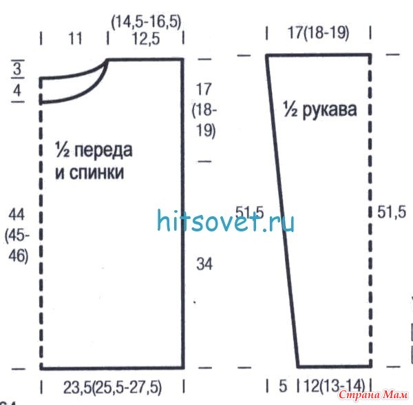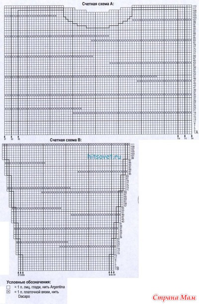 Перед: вязать как спинку, только с более глубоким вырезом горловины. Для этого в 95-м (97-м) 99-м р. счетной схемы закрыть средние 10 п. и обе стороны закончить раздельно. Для закругления закрыть с внутреннего края в каждом 2-м р. 14, 22 и 21 п. Петли плеча закрыть с внешнего края на высоте спинки. Вторую сторону закончить симметрично.