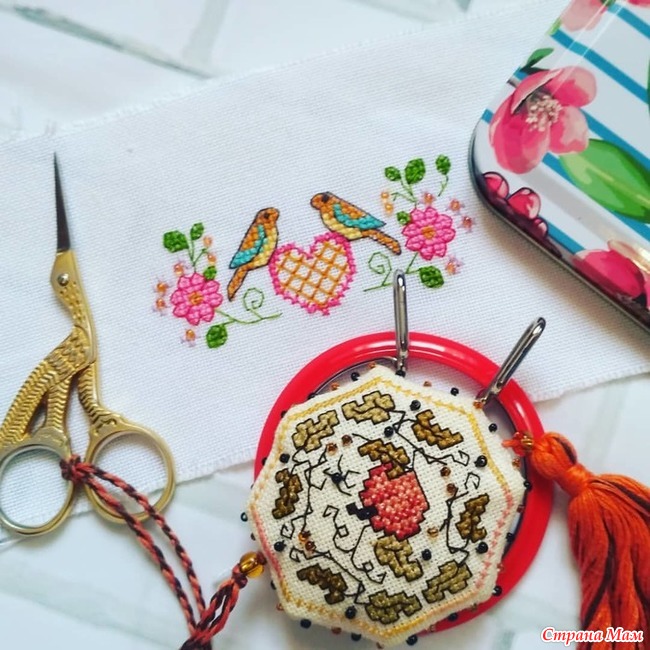 2. Даша мне за неделю до поездки скинула интересную ссылочку, согласно которой надо было вшить небольшую схемку, сдать ее и мне дадут за нее что-то приятное. Ну как не попробовать?! И я быстренько вышила этих чудесных птичек. Даже не забыла привезти их с собой