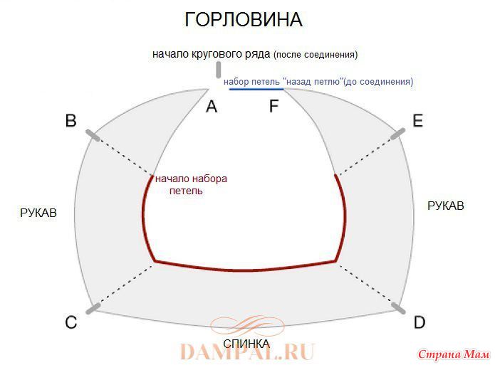 На этот момент на спицах находится 50 (54, 58, 64, 68, 72, 78) петель спинки (между точками С и D на схеме) и 40 (44, 48, 52, 56, 60, 64) петель переда (между точками А и В, Е и F на схеме).
