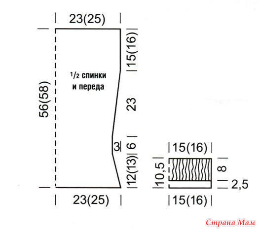Перед/спинка: для каждой из деталей наберите цепочку из 93 возд. петель + 4 возд. петли для подъема и вяжите узором по схеме. При этом первый раз свяжите все три ряда по схеме, а дальше повторяйте только 2-й и 3-й ряды. Для получения приталивания по боковым сторонам убавьте в каждом следующем 4-м ряду 4 раза по 1 петле, затем вяжите прямо до высоты 18 см. Теперь прибавьте с обеих сторон в каждом следующем 4-м ряду 4 х 1 петле. Затем снова вяжите прямо до высоты 56 см, где завершите вязание, обрежьте и закрепите нить.