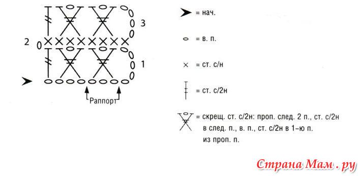 1 возд. петля подъема, *1 ст. с накидом в след. столбик с накидом, 20 возд. петель, 1 соед столбик в 1-й столбик с накидом края проймы, 20 возд. петель, 1 соед. столбик в 11-ю возд. петлю после столбика с накидом манжета*, повторяйте от * до *, закончите 1 соед. столбиком в 1-ю возд. петлю после столбика с накидом проймы.