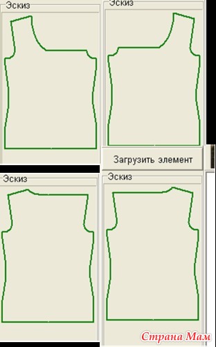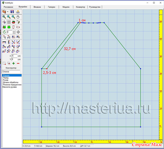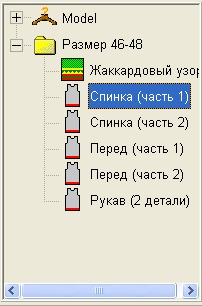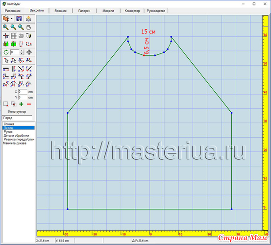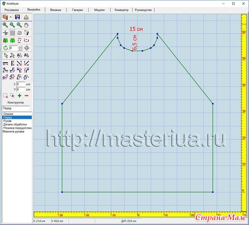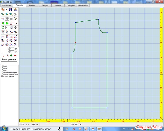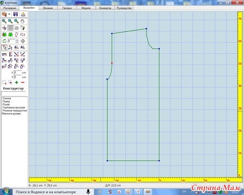 Теперь вернемся с выкройке в КС. Если вы слабы в программе, то можно сразу в модуле ВЫКРОЙКА, после создания целой основной детали, допустим, СПИНКА; сохранить каждую копию детали с поправкой в области ростка, т.е. "отрезаем" ту часть, которая не вяжется в режиме ЧВ и сохранем, а потом в модуле ВЯЗАНИЕ используем по очереди. Если в программе достаточно сильны, то достаточно одной полной выкройки, при этом корректируем деталь на определенном уровне, причем делаем это, выйдя в модуль ВЫКРОЙКА. Тут нужно учесть, если вяжем с рисунком/узором и сразу выбрали отредактированную деталь с "одним плечом", то нельзя использовать функцию отражения/разворот в модуле ВЫКРОЙКА, т.к. деталь отразится вместе с рисунком и все будет нарушено. А, если временно перешли в модуль ВЫКРОЙКА, поправили деталь и снова вернулись в ВЯЗАНИЕ, то рисунок не будет нарушен.