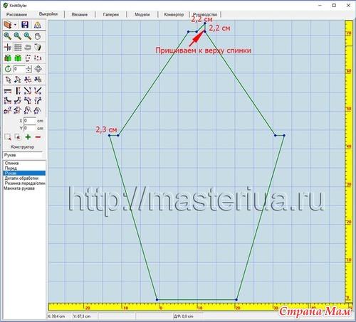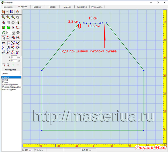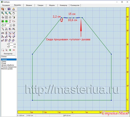 Пока все делали в см, мм, но потом переходим к петельному расчету и тут я программе не доверяю. Любая программа показывает убавку/прибавку на краю детали, а мы можем убавлять сразу несколько петель деккером. Как линию реглана и формируем таким приемом. Поэтому, когда выкройка сбалансирована в сантиметрах, я делаю распечатку из модуля ВЫКРОЙКИ всех основных деталей и уже на бумажном листе выполняю свой расчет и в частности распределяю групповые убавки по линии реглана, чтобы они красиво смотрелись в изделии.